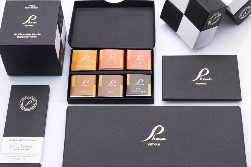 20種類を超えるフレーバーチョコレートが揃い、ペッパーやチリなどベトナムらしいアクセントを効かせた味も人気。甘さだけでなく、カカオの深みをしっかり感じられるラインアップです。