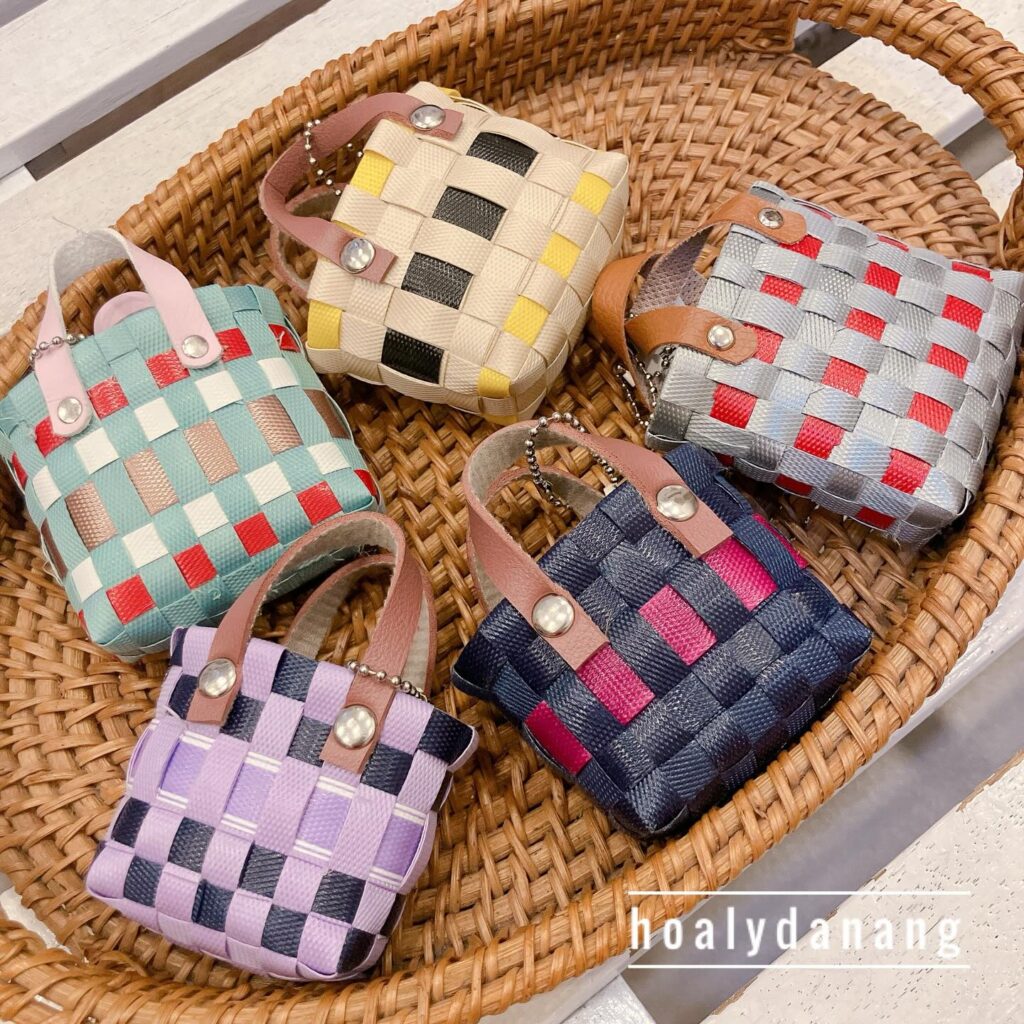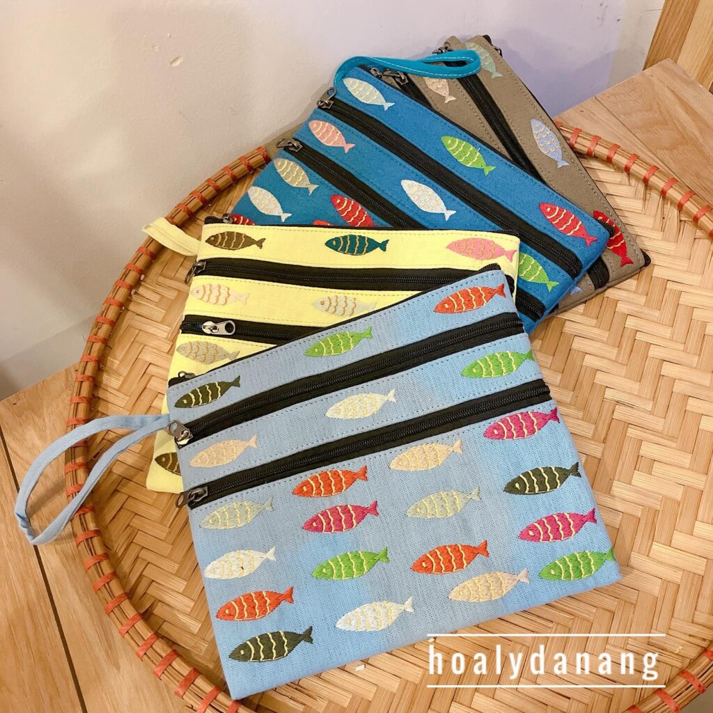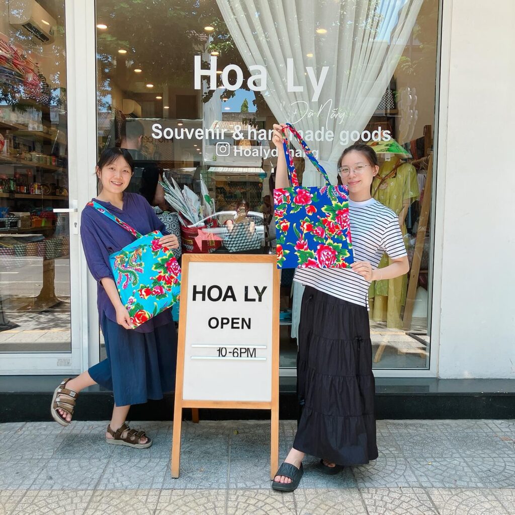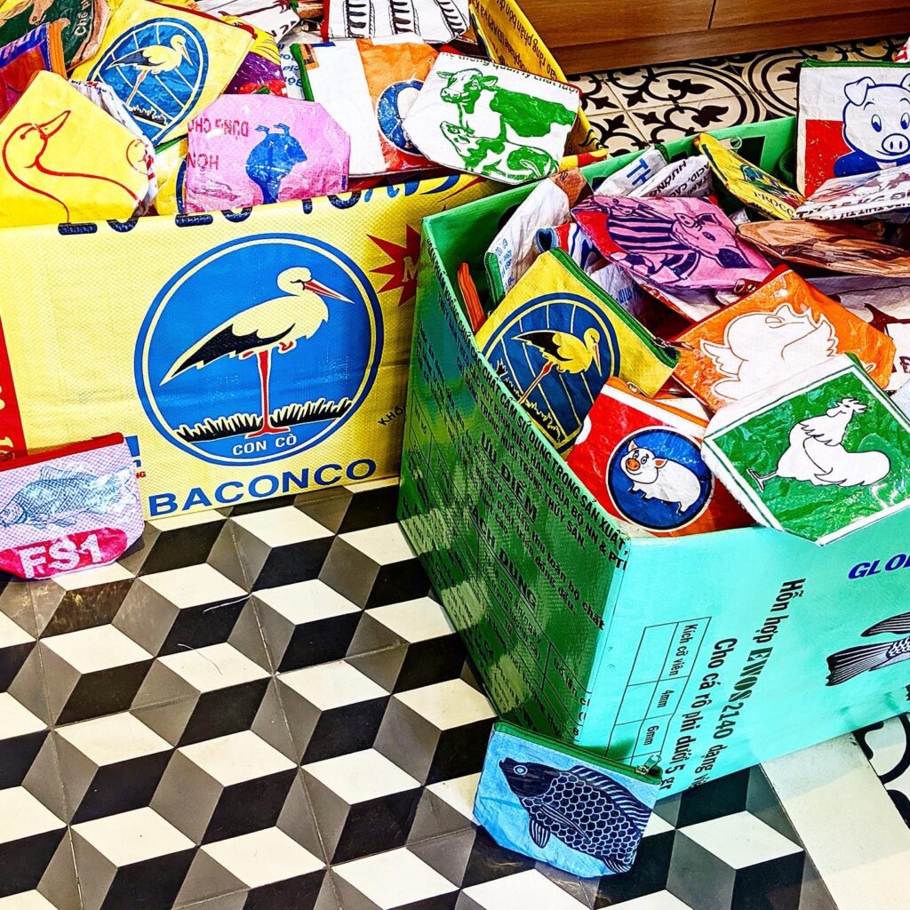 店内には、ベトナムで実際に使われていた飼料袋をリメイクしたポーチやバッグ、少数民族の織物アイテム、カラフルで実用的な雑貨などが並び、一部の商品には日本語表記もあります。