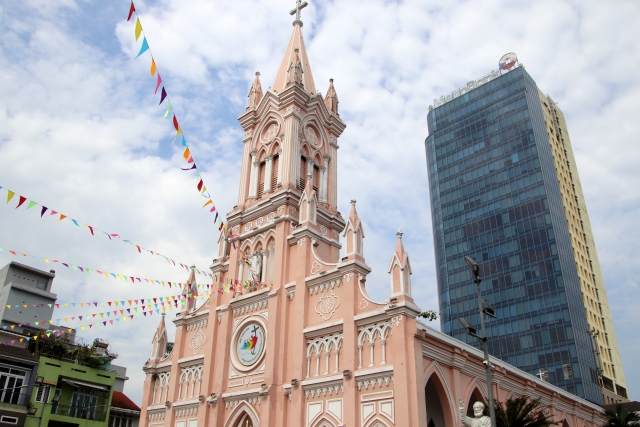 ダナン市内のシンボル的存在。ピンク色の外観が可愛らしい教会で、雨の日でも写真映えします。市内中心部にあり、ショッピングや食事と合わせて立ち寄りやすいスポットです。