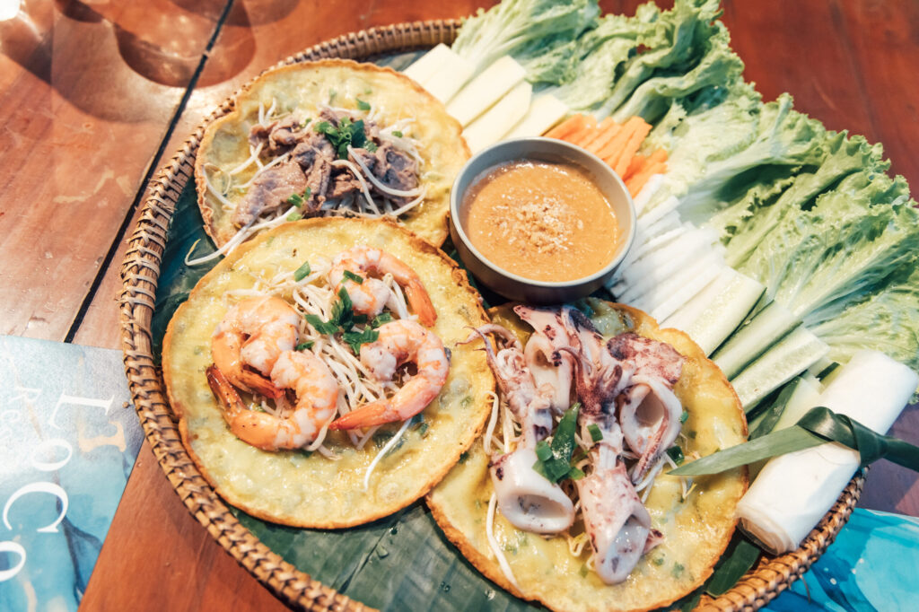 粉の生地を丸い型で焼き上げる、ベトナム風パンケーキ。