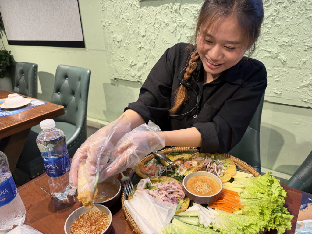パリッと香ばしい生地に野菜をのせ、ライスペーパーで包んでいただきます。