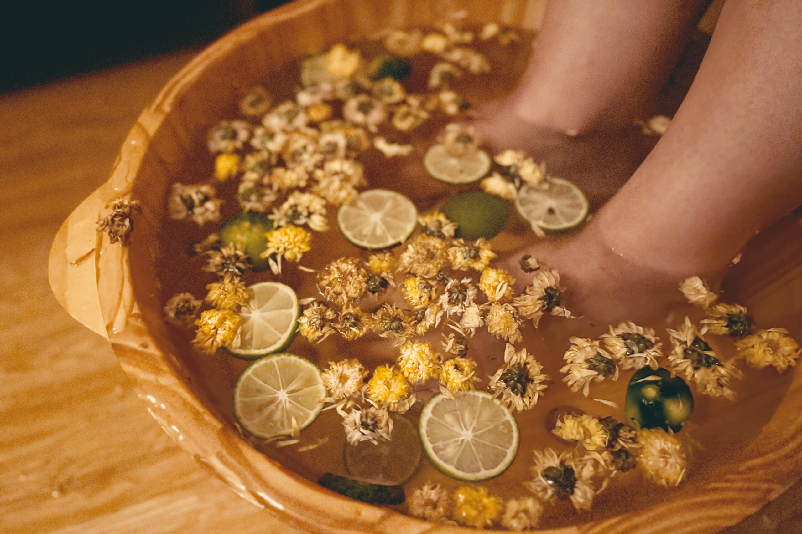 室内で施術着に着替えたあと、まずはお花が浮かんだ可愛らしい足湯へ。