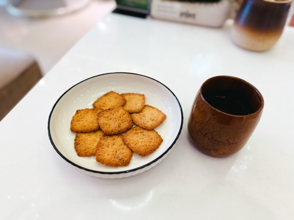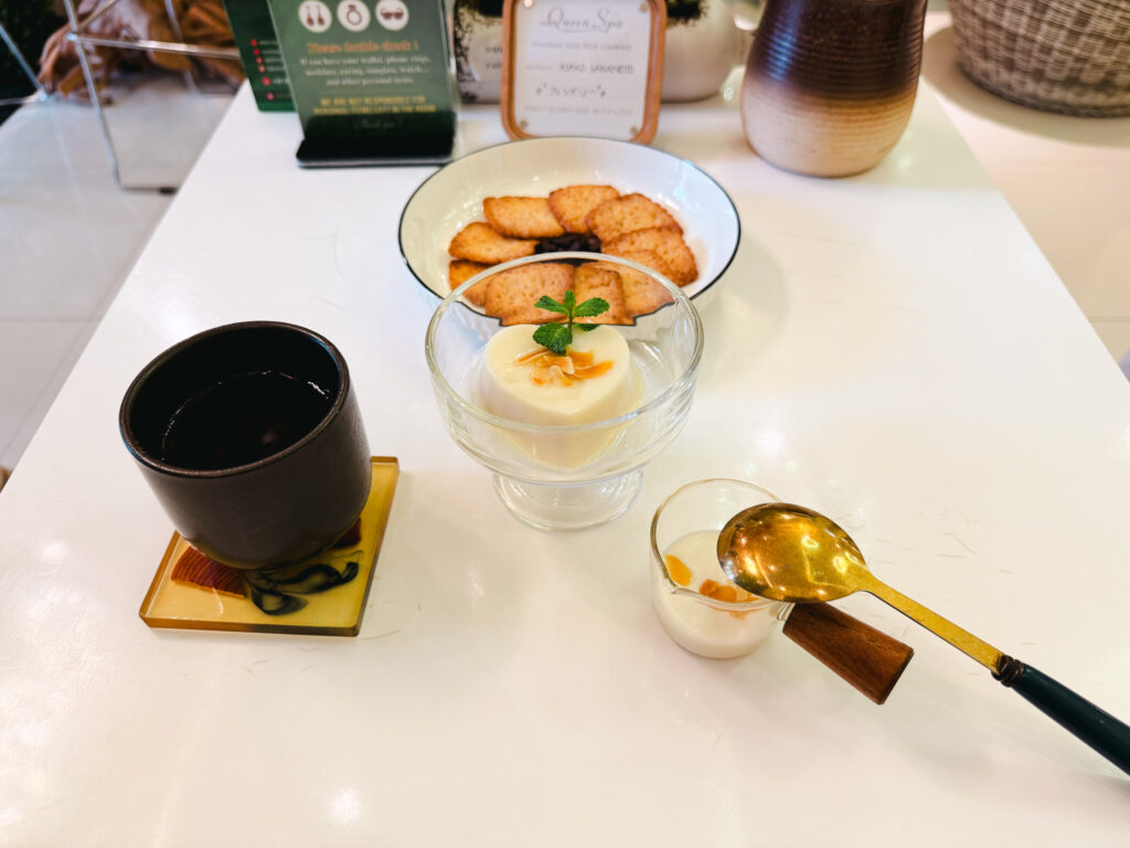 施術後、明るいロビーに戻ると、ドリンクとクッキー、豆乳プリンにヨーグルトが用意されていました。
