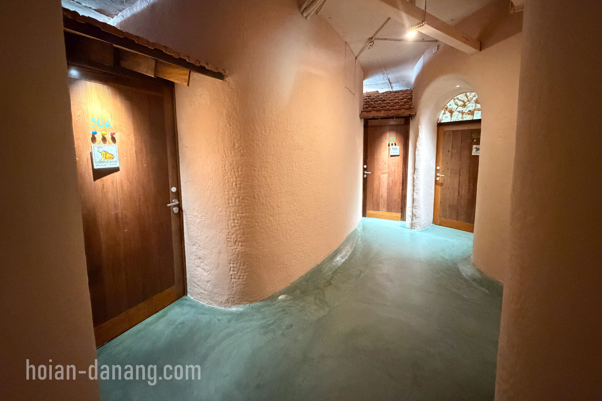 客室へ向かう廊下は、曲線を描く洞窟のような造り。
